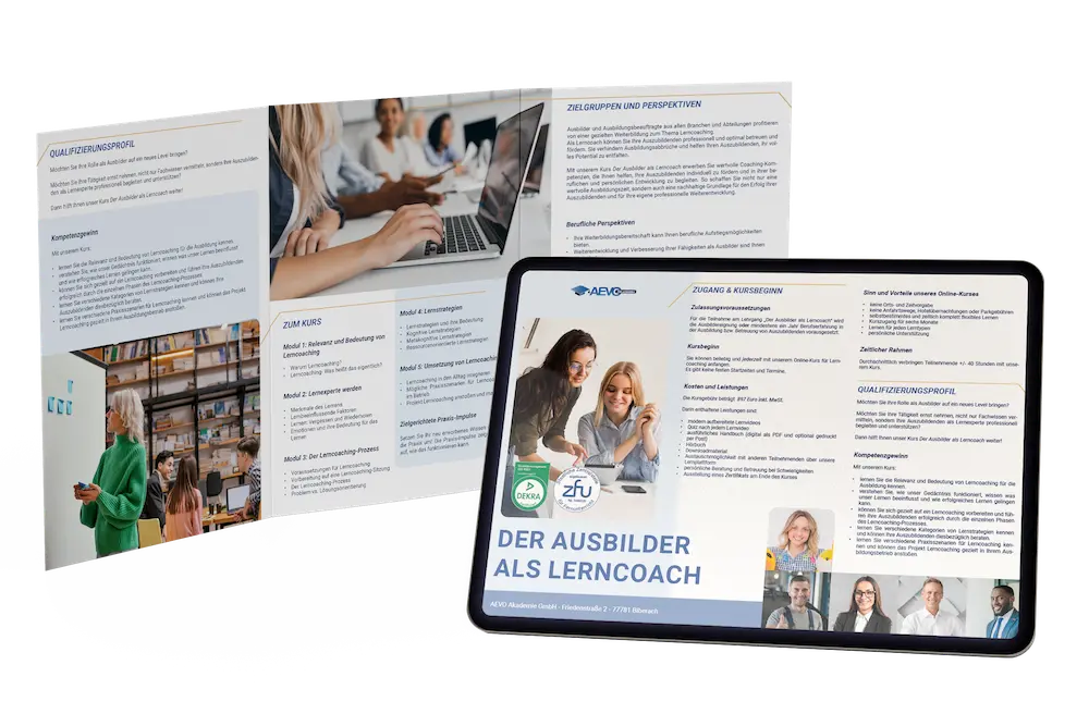 Unser Lerncoaching kurs Der Ausbilder als Lerncoach ist für alle Branchen und Berufe geeignet. Der Kurs und die Inhalte wurden von zertifizierten Lerncoaches und Dozenten mit AEVO-Prüfungspraxis entwickelt.